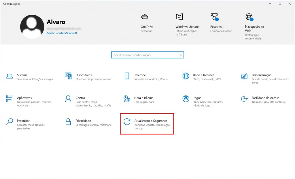 2. Clique em “Atualização e Segurança”;